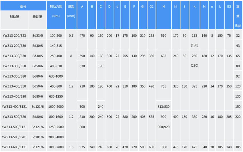 YWZ13系列電力液壓鼓式制動(dòng)器的安裝尺寸和制動(dòng)力矩參數(shù)符合JB/ZQ4388-1997標(biāo)準(zhǔn),其技術(shù)要求符合JB/T6406-2006標(biāo)準(zhǔn)。
